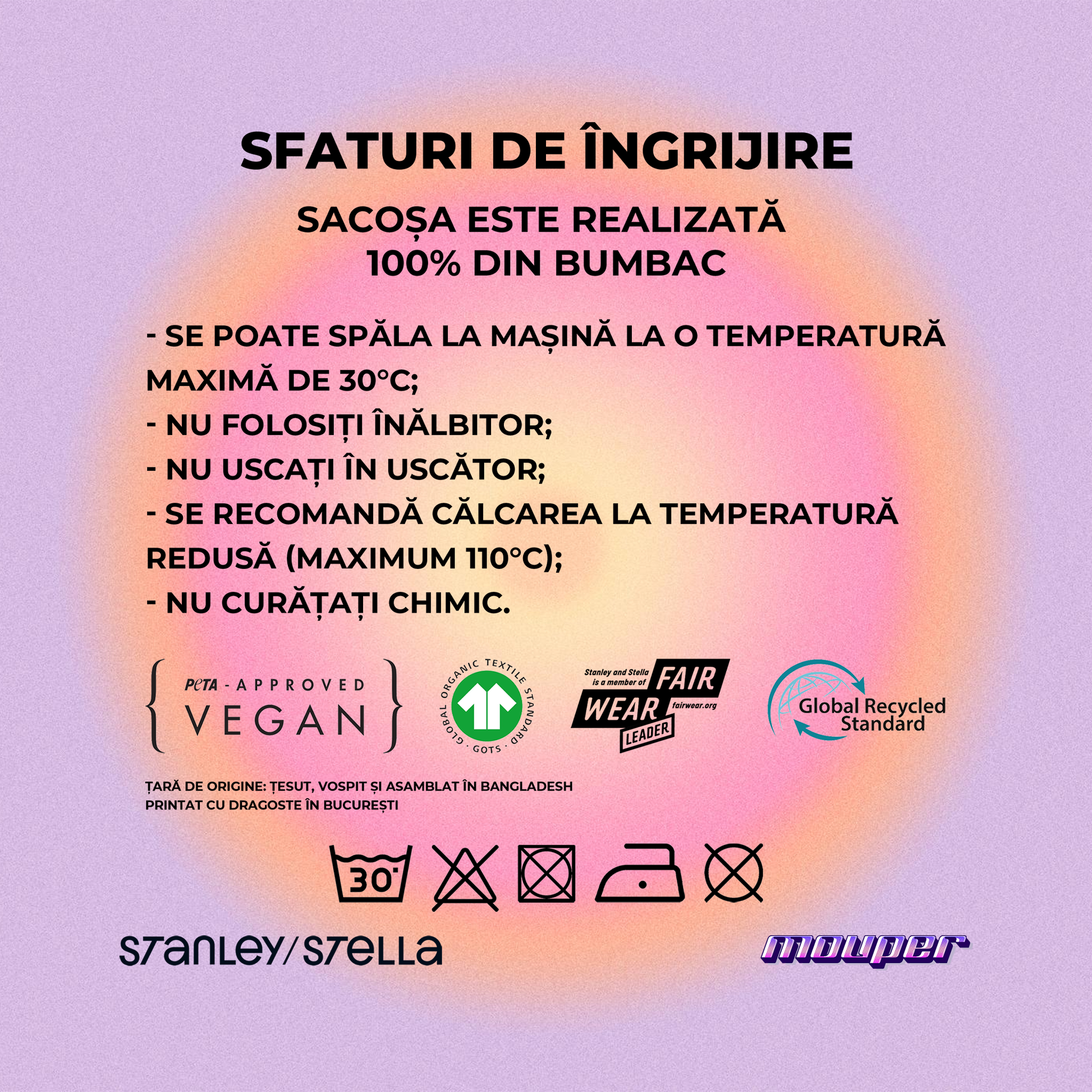 Evitați căldura: Nu uscați hainele la temperaturi ridicate, deoarece acest lucru poate provoca decolorare și deteriorarea țesăturii.